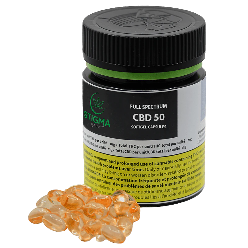 Stigma Grows Full Spectrum CBD 50 Softgel capsules are an easy and convenient way to get the high dose of a Full Spectrum CBD that you've been looking for. Leaving nothing behind, you will find the full range of cannabinoids you would expect present in each capsule. Created using the popular hybrid CBD stain Sour Space Candy, these capsules are sure to tick every box when it comes to a well rounded CBD product.